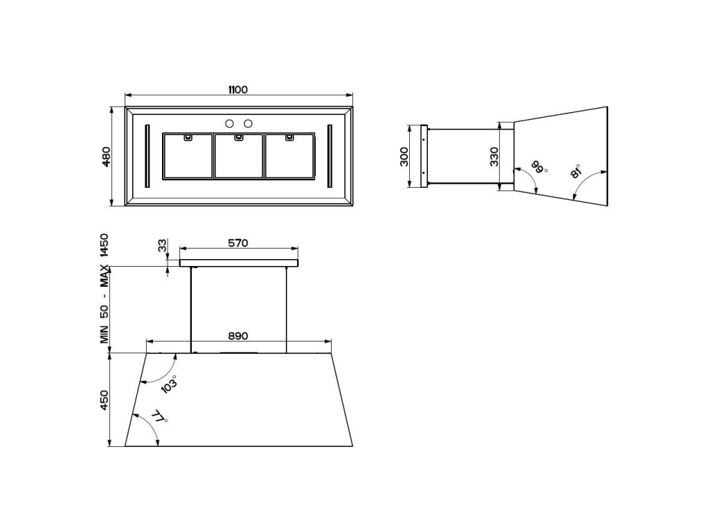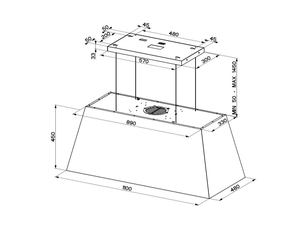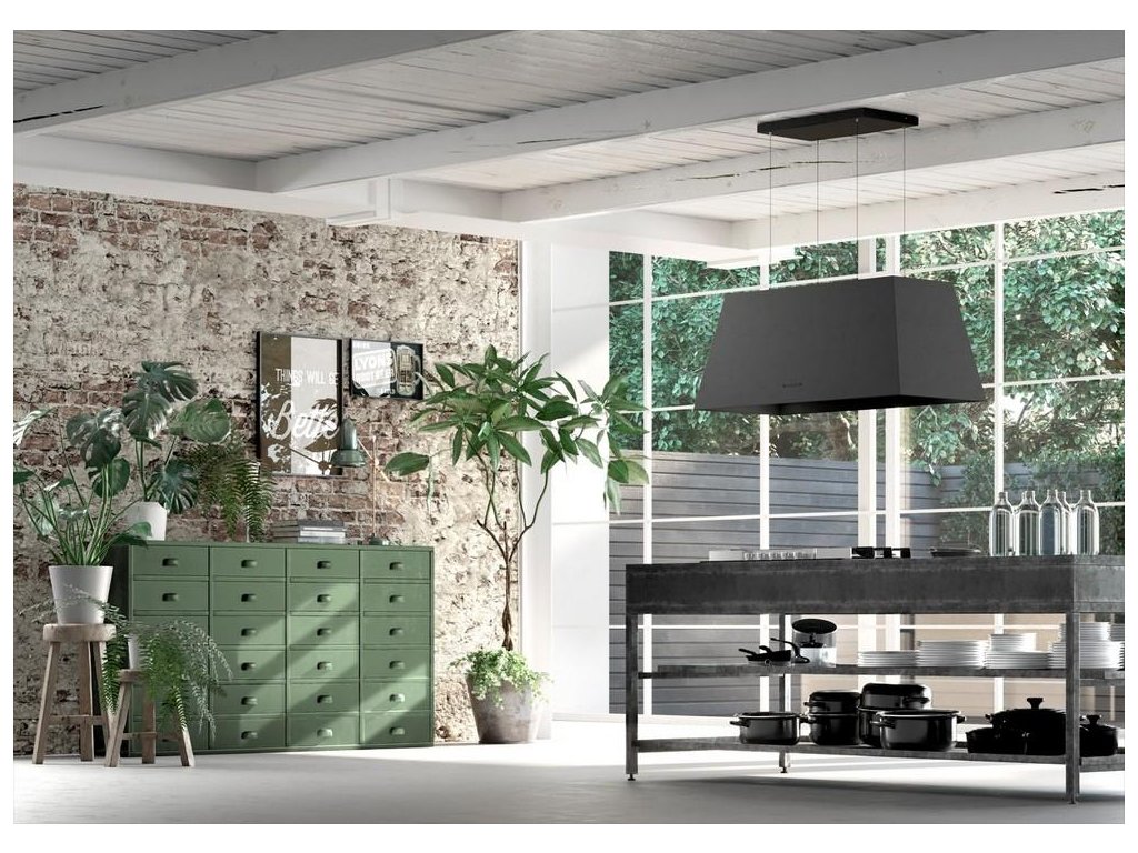 Digestoř může fungovat jako odsavač par elegantně zavěšený na lankách připevněných k stropnímu panelu v barvě digestoře, nebo může fungovat jako odsavač s komínem (volitelně) rovněž v barvě digestoře.