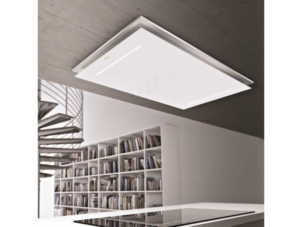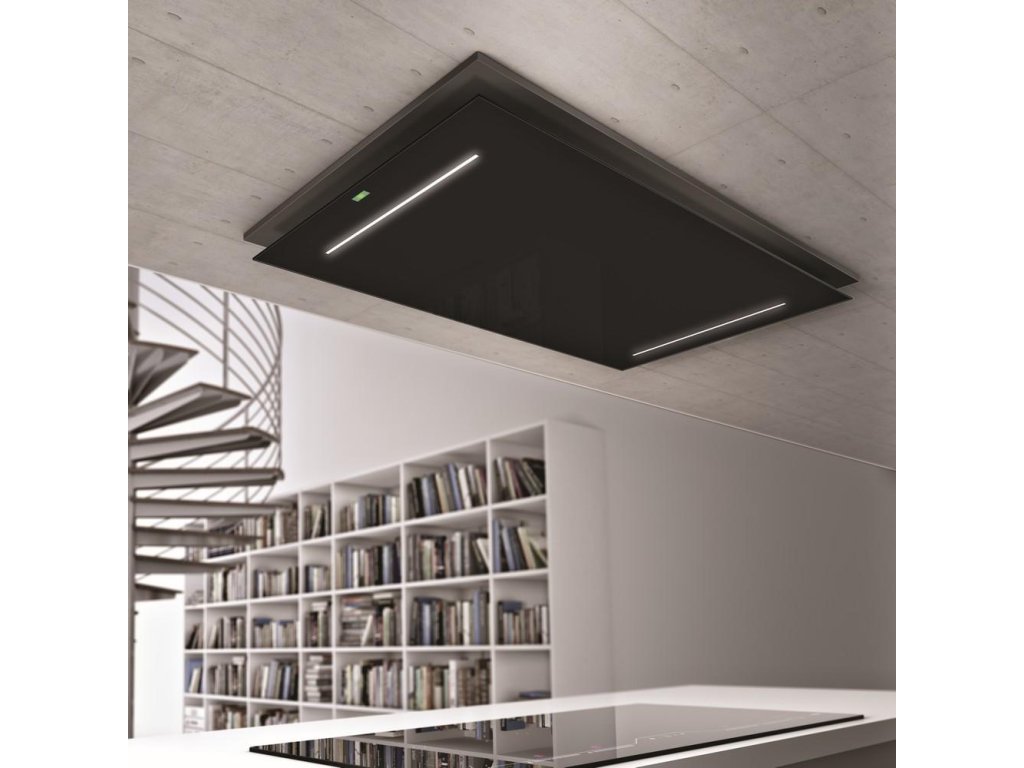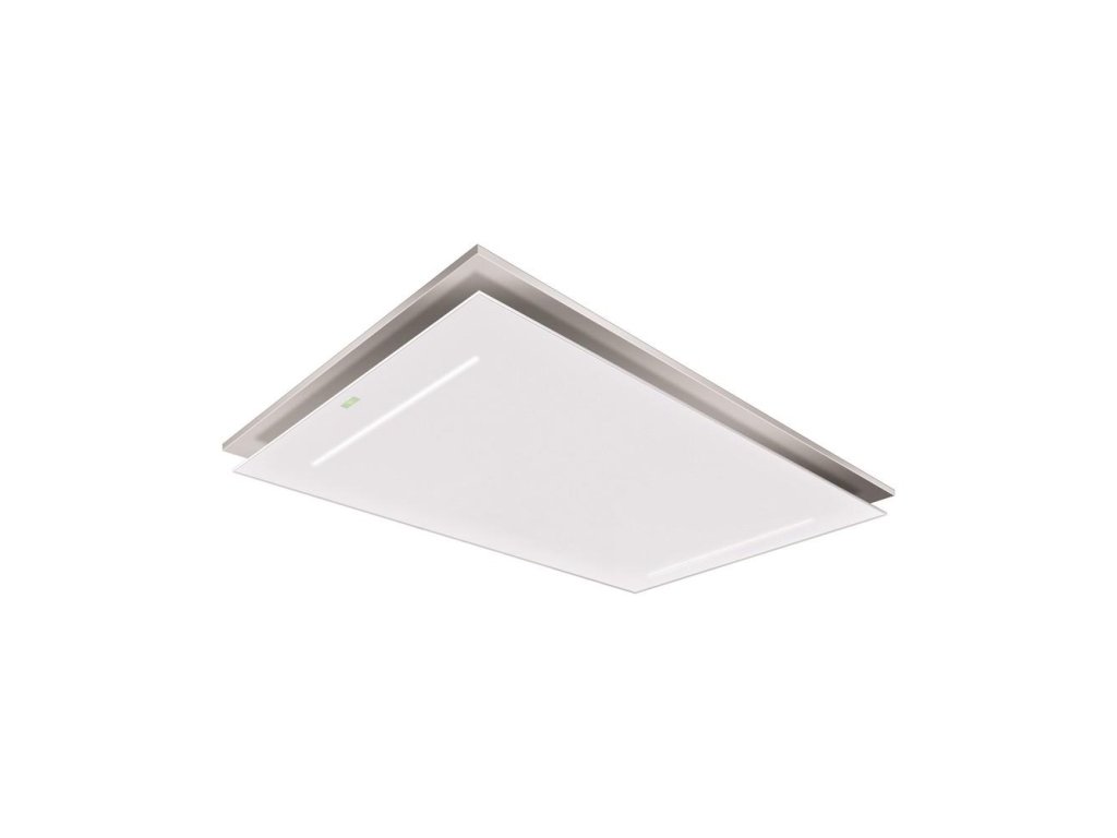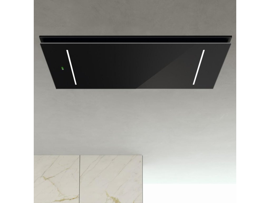 Luxusní stropní digestoř v elegantním provedení je vybavená výkonným motorem s nízkou spotřebou elektrické energie.
