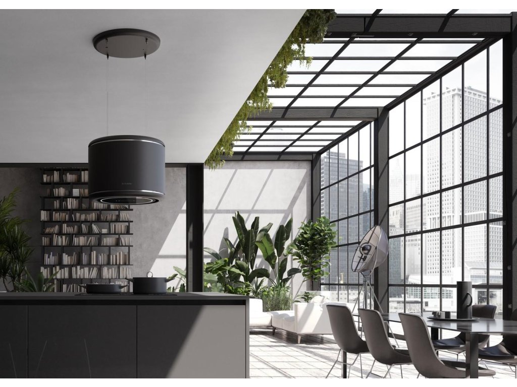 Dokonale válcový tvar ukrývá high-tech srdce digestoře ODETTE a dodává kuchyni nezaměnitelný nádech současného designu.
