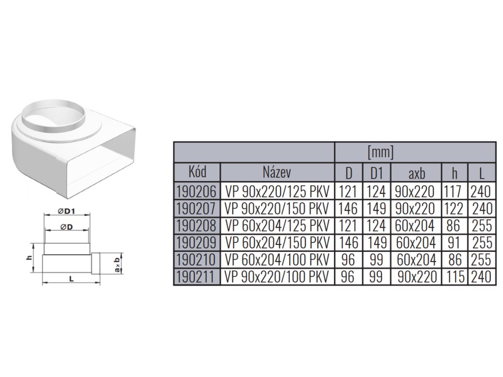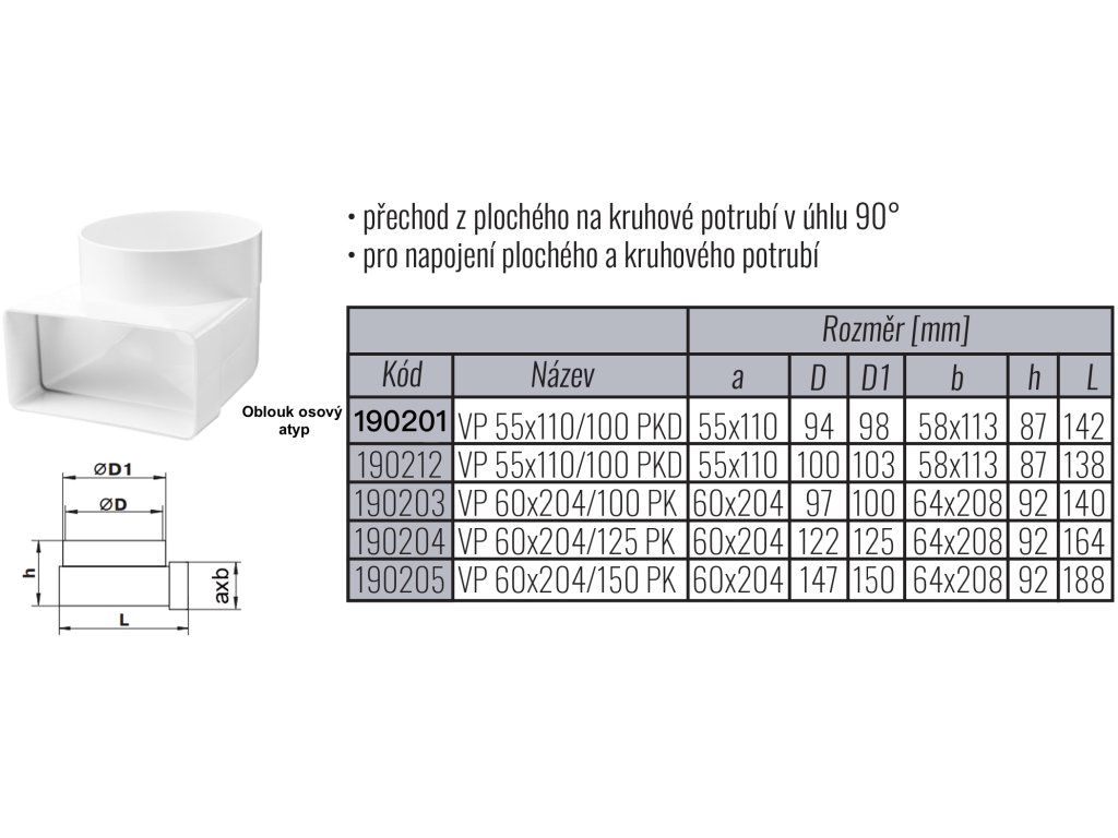 K oblouku osovému VP 60 x 204 / 100 PK (kód 190203) je pro napojení kruhového potrubí potřeba použít