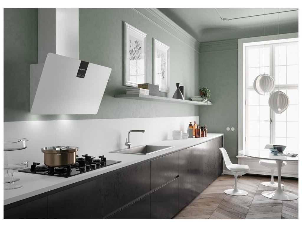 Díky speciálnímu povrchovému materiálu FENIX NTM (odstín Bianco Kos) je odsavač par SOFT EDGE hebký na dotek, navíc je odolný vůči otiskům, neodráží světlo a snadno se čistí. Unikátní je možnost odstranění případných škrábanců – díky reakci nanočástic na teplo lze zacelit povrch žehličkou nahřátou na 120°C.