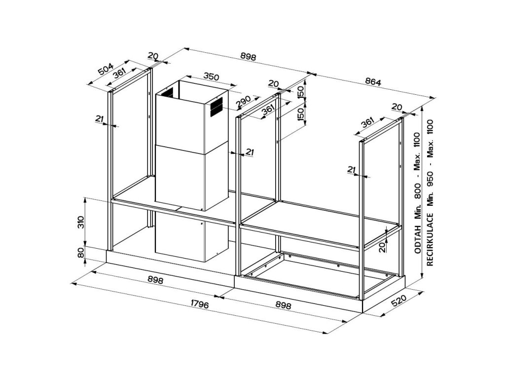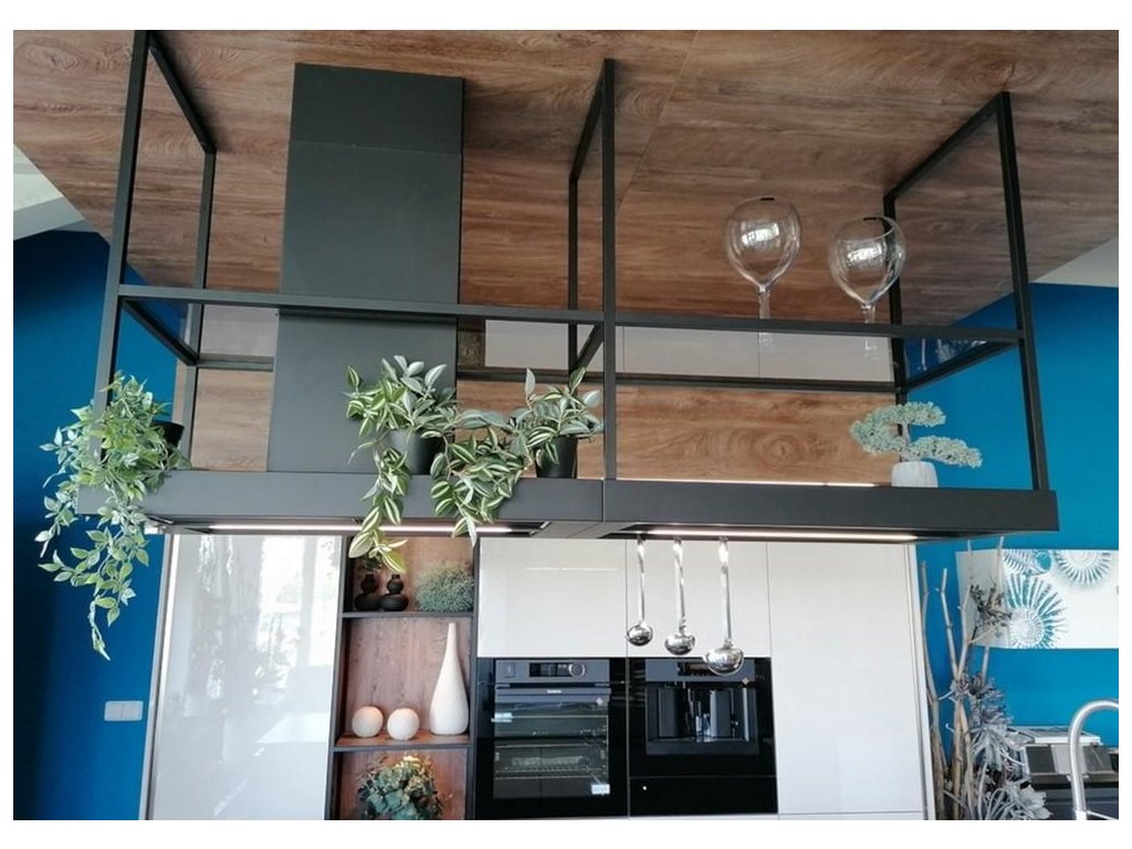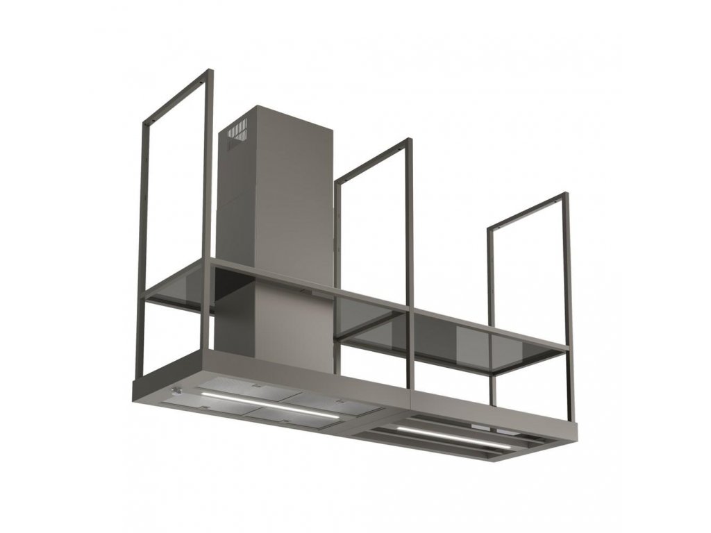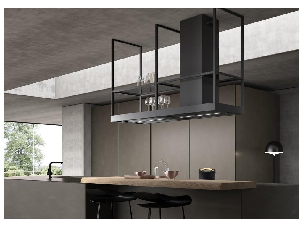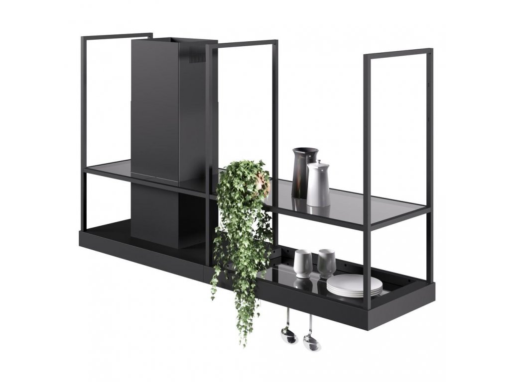 T-Shelf je ikonická ostrůvková digestoř v elegantním industriálním stylu. Díky vzdušné závěsné konstrukci, praktickým policím z kouřového skla a dvěma LED panelům se stmívačem osvětlení se snadno stane centrálním prvkem moderní kuchyně. Elegantní matně černý odstín RAL 9005 se bude hodit do každého interiéru.