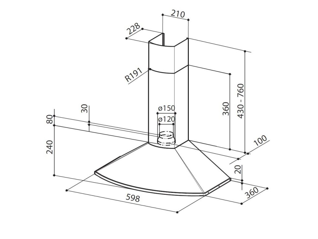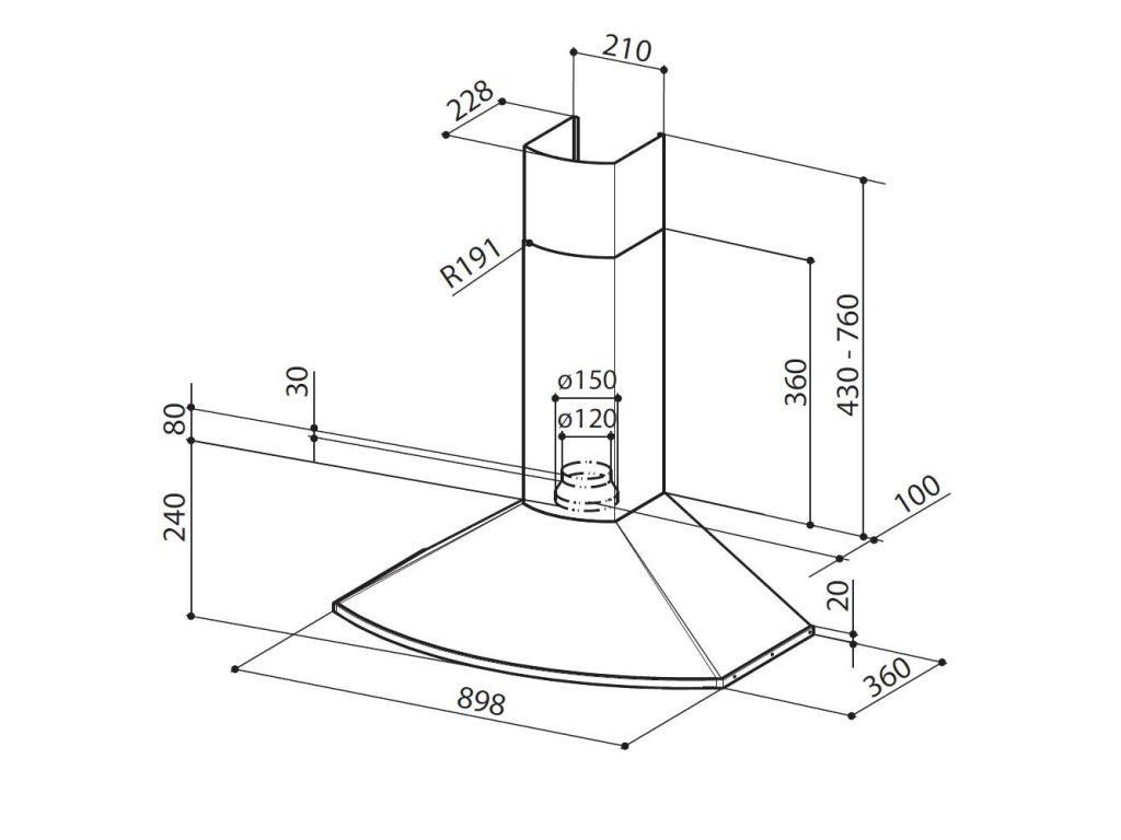 Digestoř Tender v nerezovém provedení má zaoblenou čelní linii, zatímco boky zůstávají rovné s ohledem na umístění výrobku mezi skříňky.