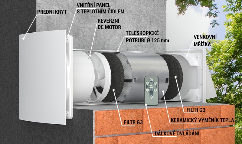 Decentrální lokální rekuperace Ventila FRESH 125 se instaluje přímo do obvodové zdi bez nutnosti vytvářet složitý rozvod vzduchu. Díky teleskopickému potrubí s rozsahem 300 až 580 mm je možné jednotku přizpůsobit různým tloušťkám zdí, což z ní dělá ideální volbu pro novostavby, rekonstrukce, moderní byty i starší rodinné domy.