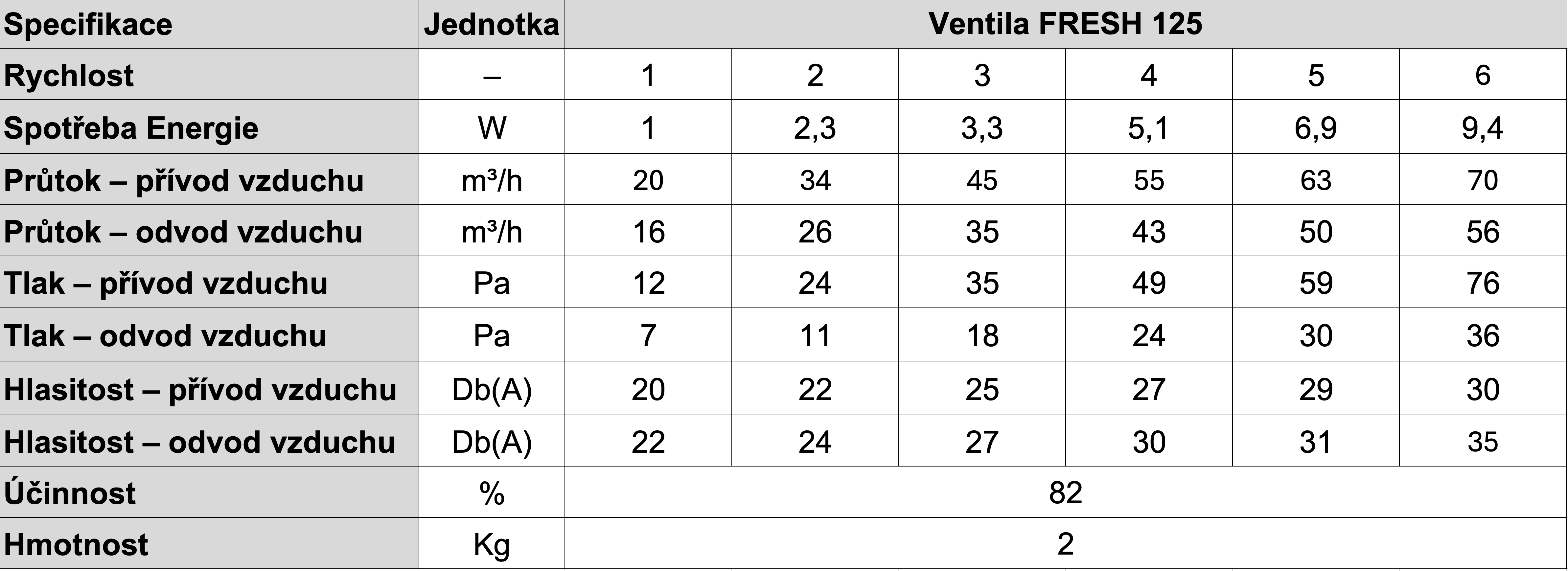 Specifikace větrací pokojové jednotky Ventila FRESH 125.