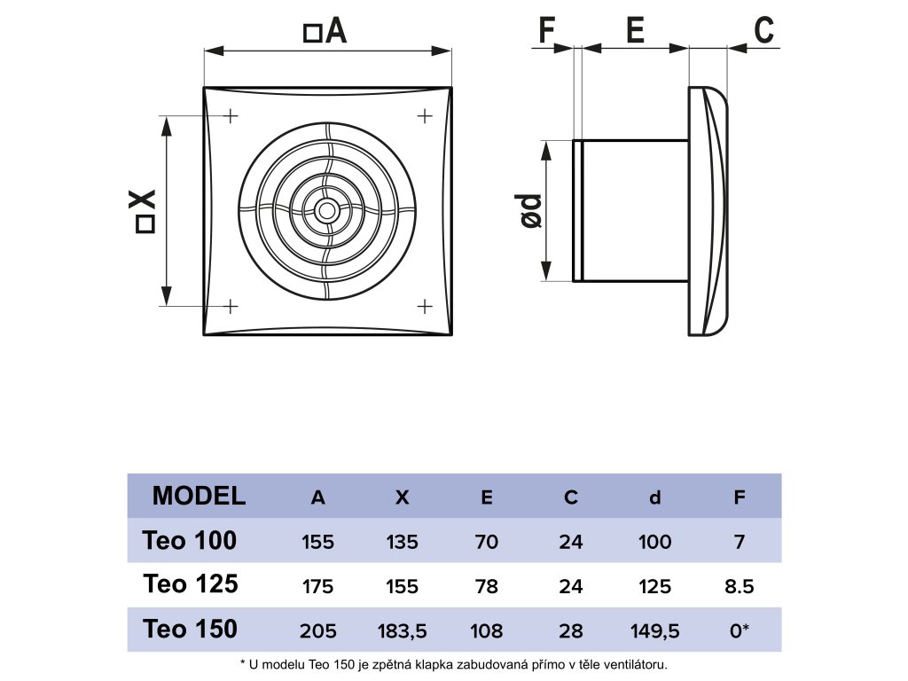 Ventila Teo Silent 150 je tichý a spolehlivý dvourychlostní ventilátor do koupelny, který je vybaven nízkoenergetickým kuličkovým motorem s průtokem 220/320 m³/h, životností až 40 000 hodin provozu a hlučností pouhých 28/33 dB(A). Kvalitní ABS plast nežloutne, modré LED podsvícení signalizuje chod ventilátoru a díky krytí IP24 je ideální pro bezpečné použití v koupelnách a WC.