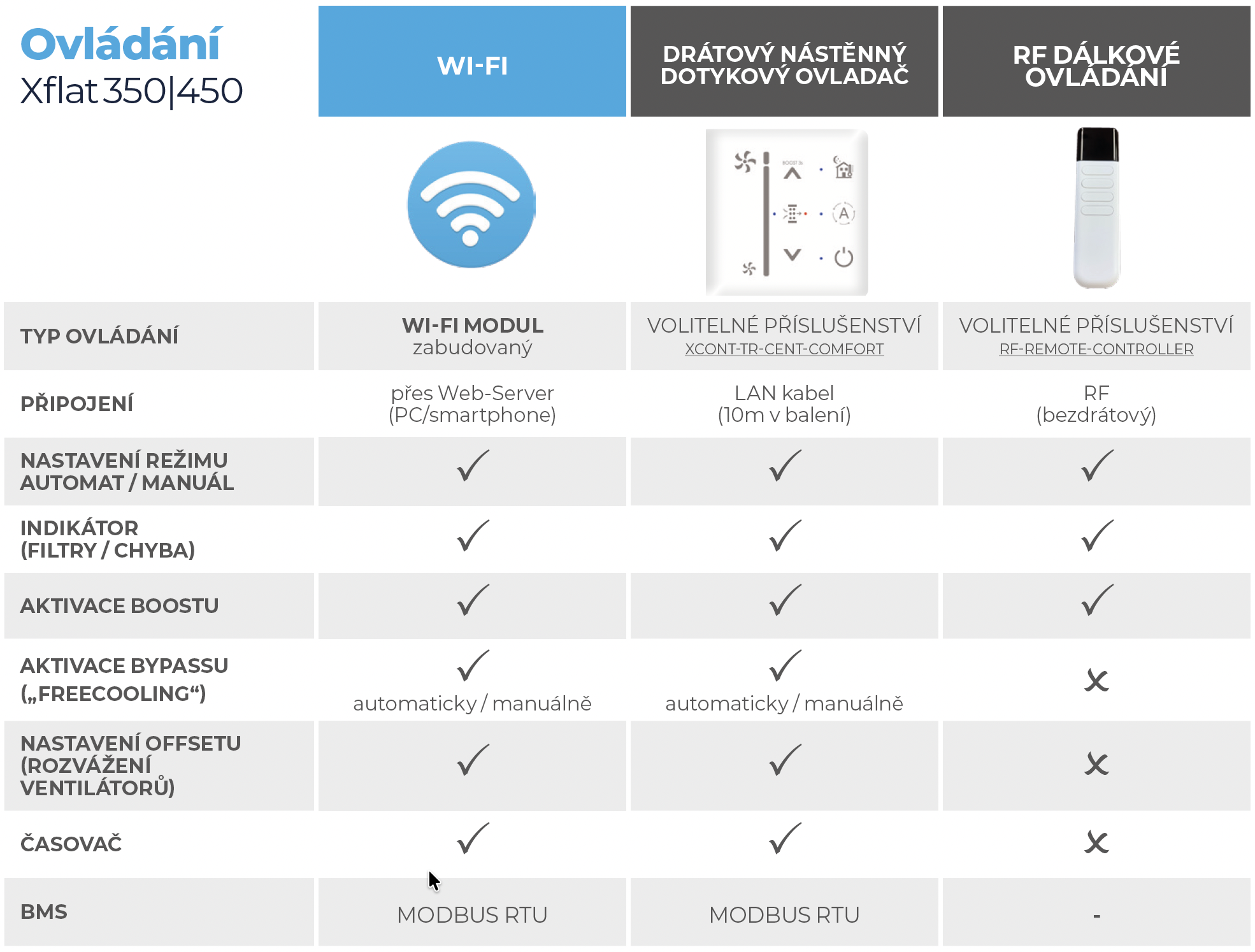 Integrované Wi-Fi ovládání, podpora Modbus RTU a možnost připojení CO₂ či vlhkostních čidel výrazně zvyšují komfort užívání rekuperační jednotky XFLAT 350/450.
