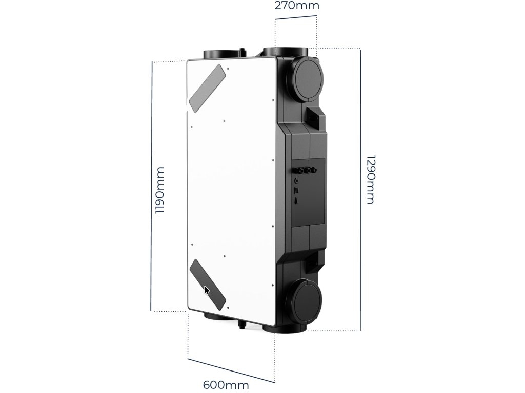 Jednotka je dostupná s tepelným (HRV) nebo entalpickým (ERV) výměníkem, nabízí vysokou účinnost rekuperace až přes 85 % a velmi nízkou spotřebu energie. Volitelný integrovaný předehřev chrání výměník proti zamrzání a přispívá k bezproblémovému zimnímu provozu.